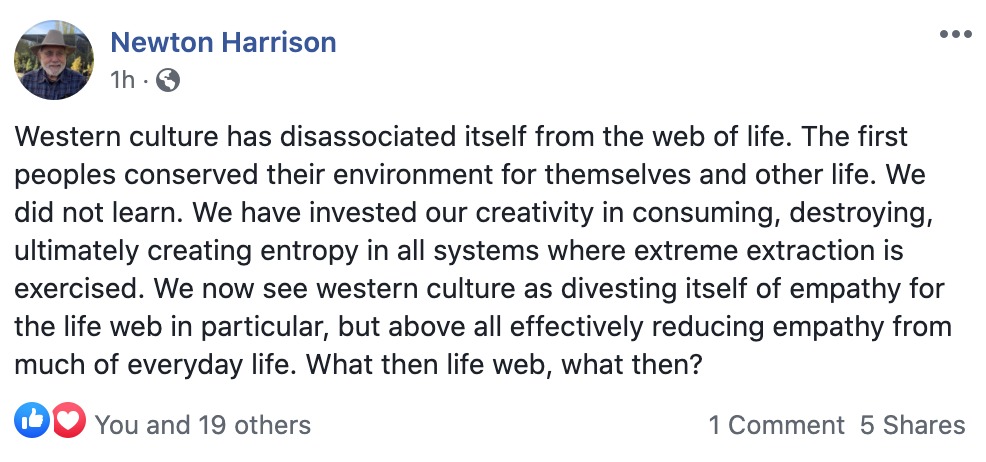 The change he envisioned was grounded in deepened relationships with places and attunement to changing ecological dynamics. Imagining post-collapse scenarios, we discussed the necessary re-emergence of bioregional governance systems, the re-localization of food systems, and the redirection of education towards capacities for survival. After half a century of experimenting with aesthetic and poetic enchantments, he’d concluded that the imminent threat of death was the ultimate teacher: